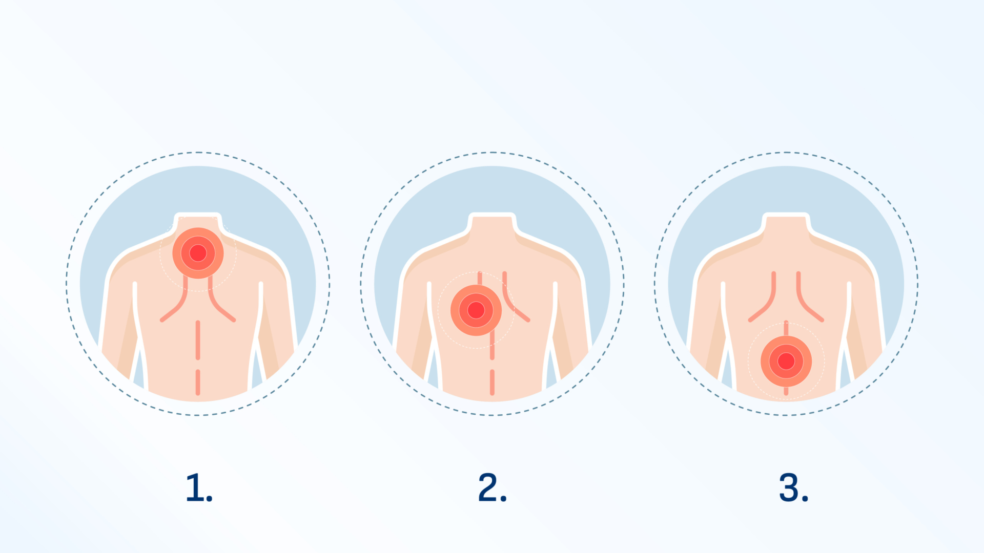 Les douleurs de la colonne vertébrale peuvent se manifester sur l’ensemble du dos – depuis les cervicales jusqu’au bas du dos. Elles peuvent être assez faibles et relativement brèves ou bien au contraire être puissantes et s’étendre sur le long terme. Les douleurs de la colonne vertébrale peuvent se manifester après une sollicitation intense, suite à une chute ou à un mouvement brusque, mais il arrive aussi parfois que la cause de la douleur ne puisse pas être définie. Elles peuvent aussi être liées à certaines maladies chroniques. [3]